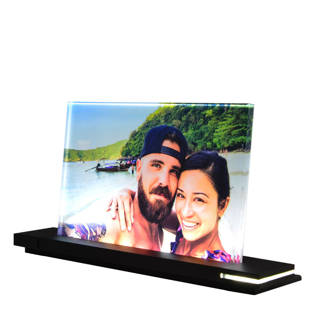 Ihr schönstes Foto wird mittels UV Druck Technik auf ein 8mm dickes Viamant Glas gedruckt und zusammen mit einem LED Leuchtsockel aus schwarz eloxiertem Aluminium samt Netzteil in Szene gesetzt.